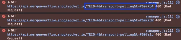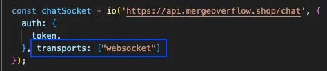 이 문제를 해결하기 위해 Socket.IO의 전송 방식을 websocket으로 설정하여, 초기 연결이 이루어진 서버에서 지속적으로 통신이 유지되도록 했습니다.