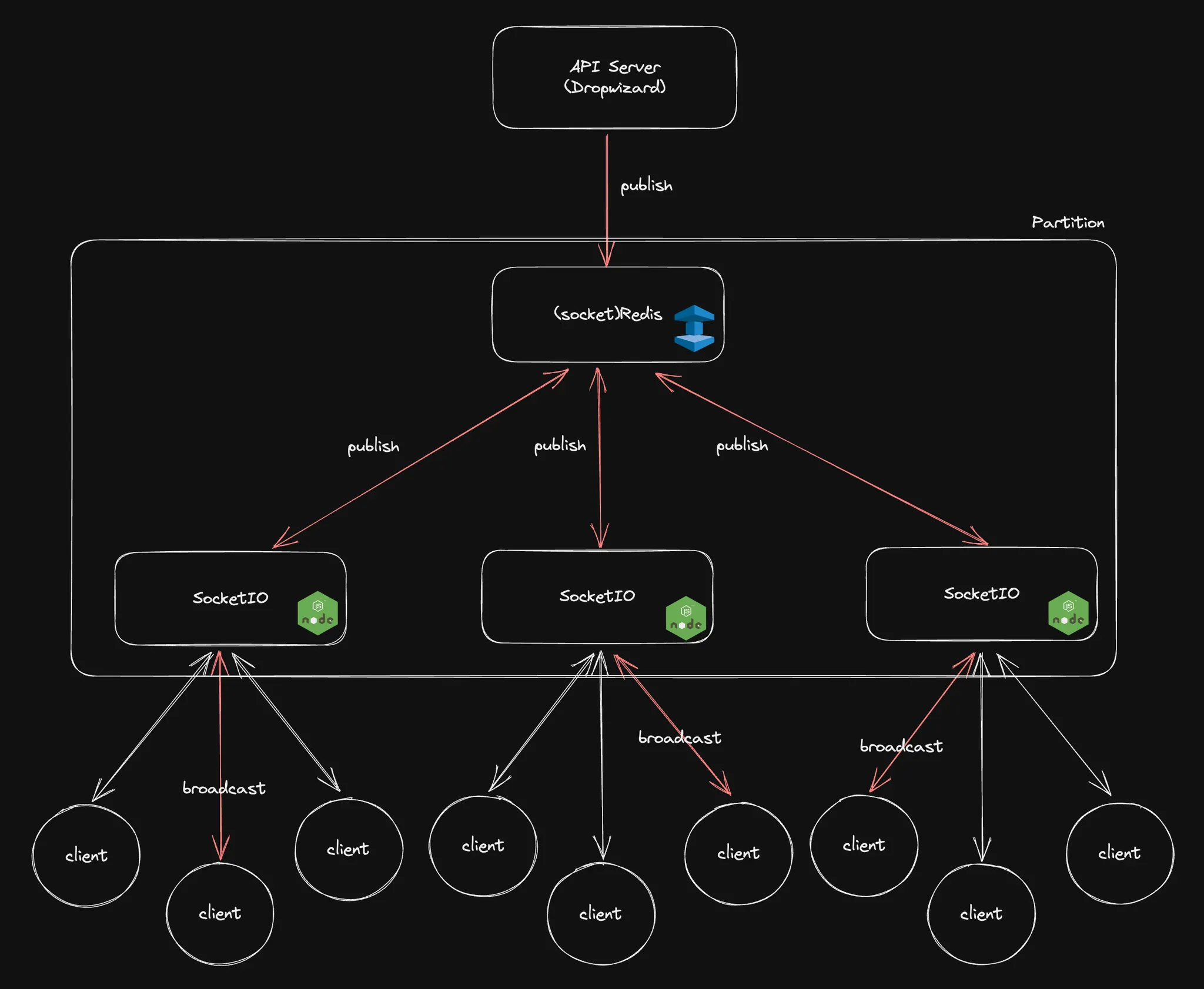 Redis 어댑터를 통해 분산된 소켓 서버들이 통합적으로 관리되고 있습니다.