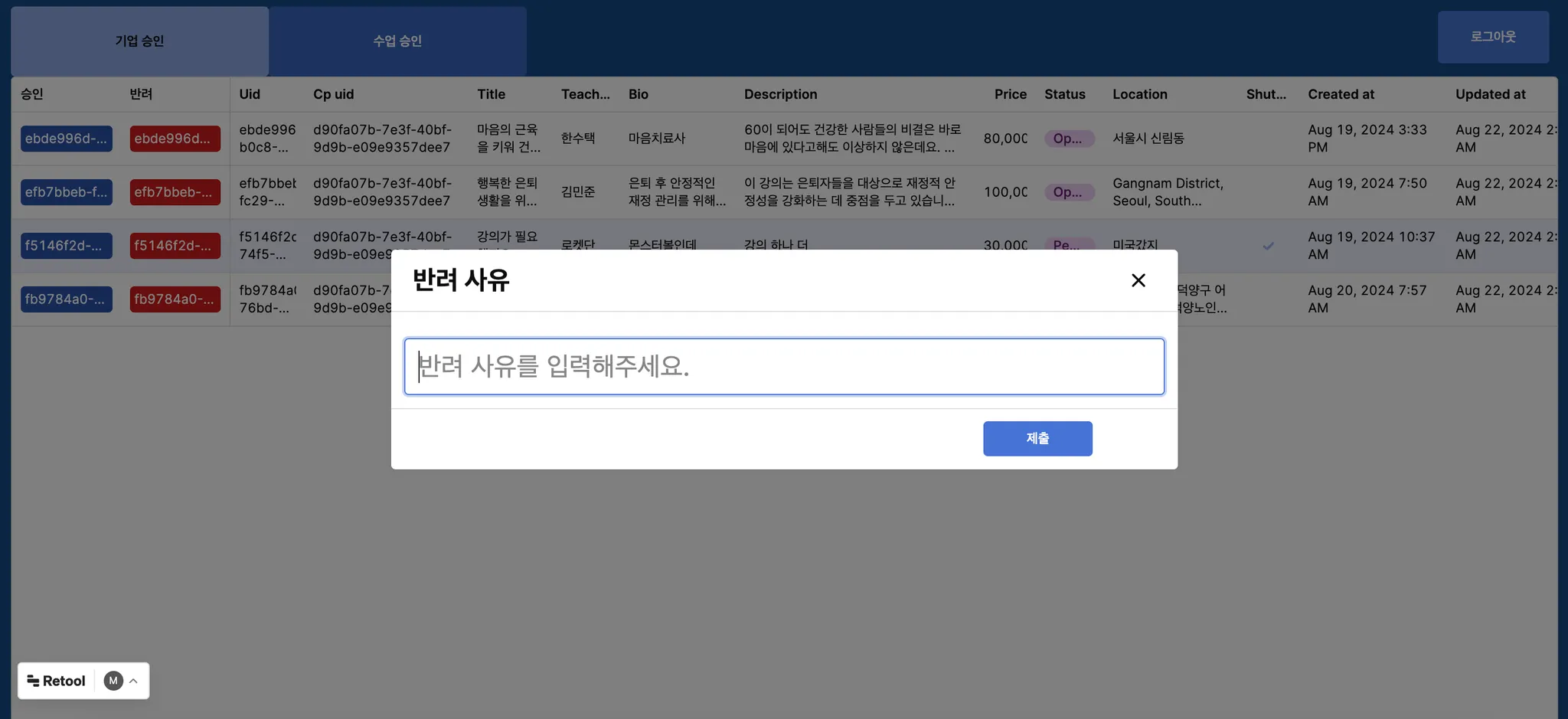 수업승인요청 테이블에서 request_status가 ‘reject’로 변하며 반려사유가 저장됩니다.