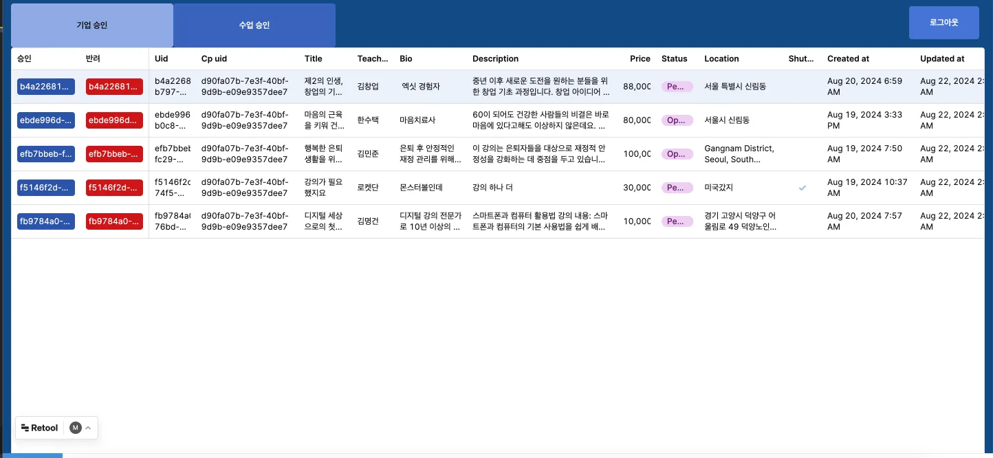 승인된 CP가 수업을 등록할 경우, 해당 수업승인 페이지에 수업신청 목록이 추가됩니다.