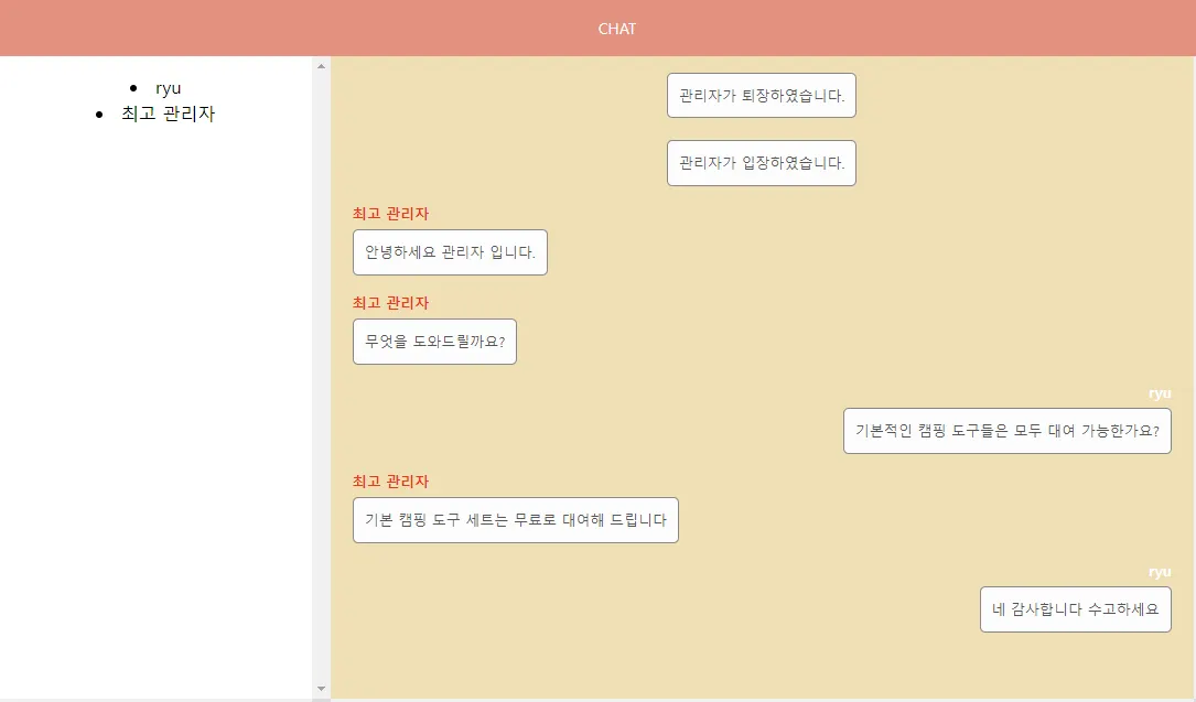 Socket.io | https를 이용한 실시간 데이터 통신으로서, 실시간으로 유저들이 채팅을 할 수 있다. 또한 실시간 알림을 통해 관리자가 입/퇴장 했는지 유무 또한 알 수 있고, 현재 채팅 접속중인 유저의 목록도 보이도록 하여 편의성을 높였습니다. |